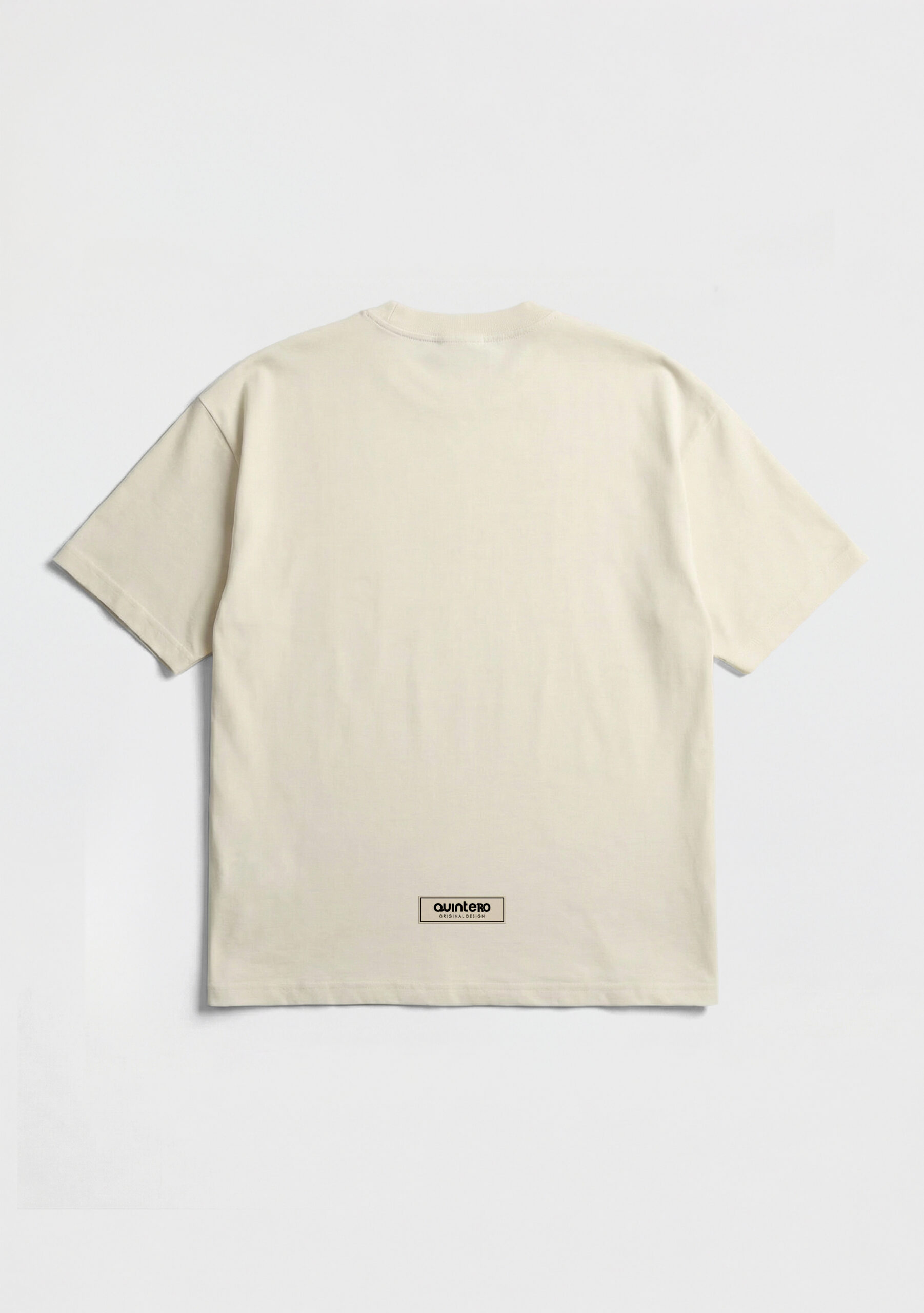 camiseta en algodón en tono beige de silueta oversize con cuello redondo tejido y estampado en alta en centro frente marquilla principal en cuello interno, marquilla bandera en costado izquierdo y marquilla pcv en posterior inferior sobre ruedo