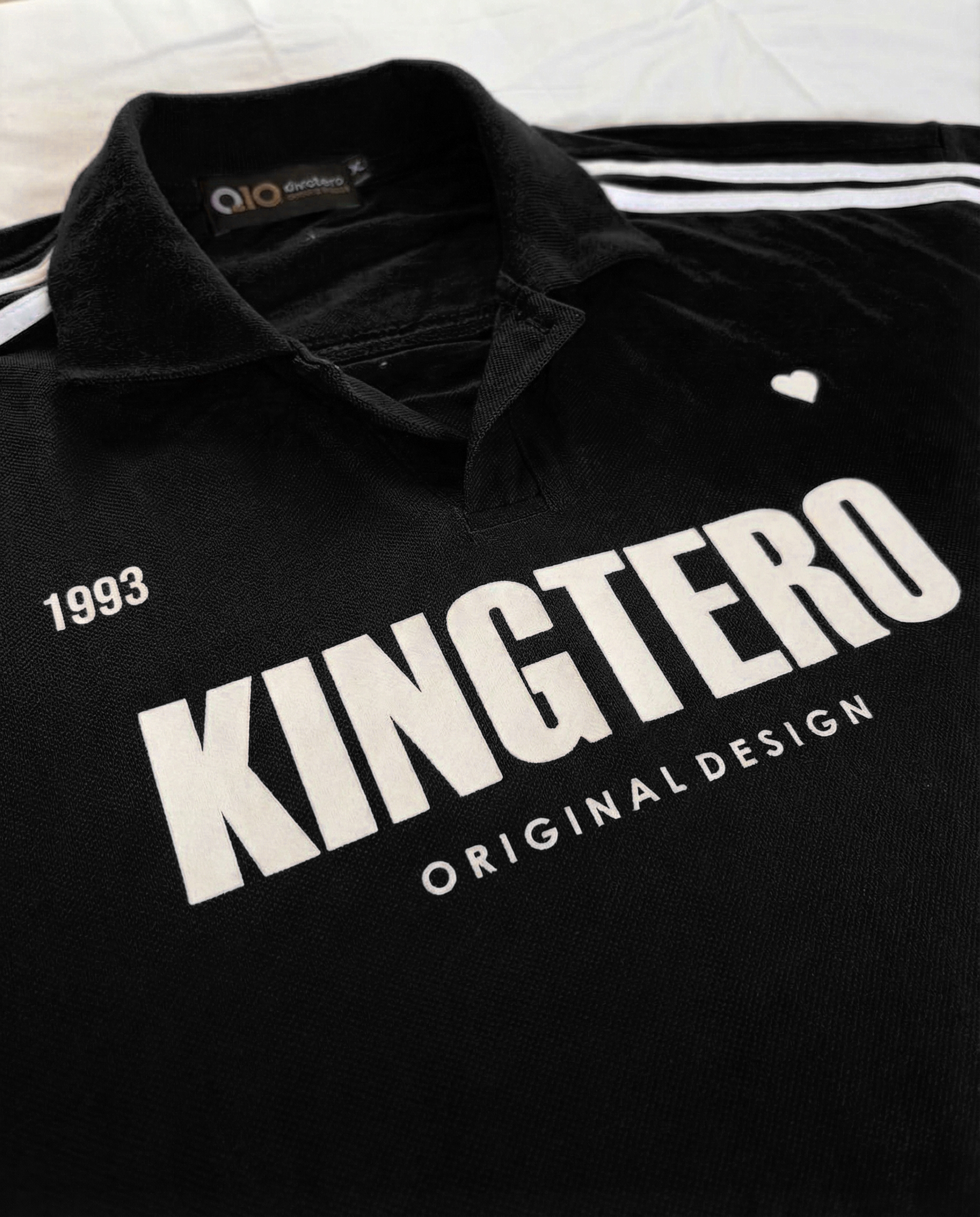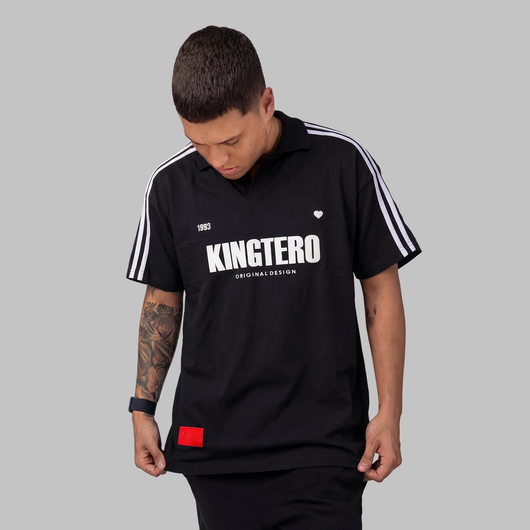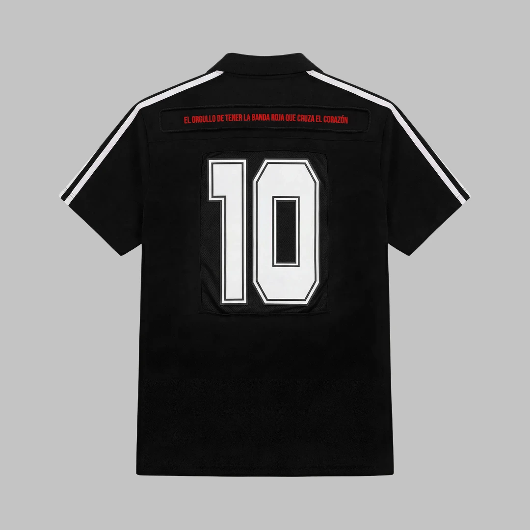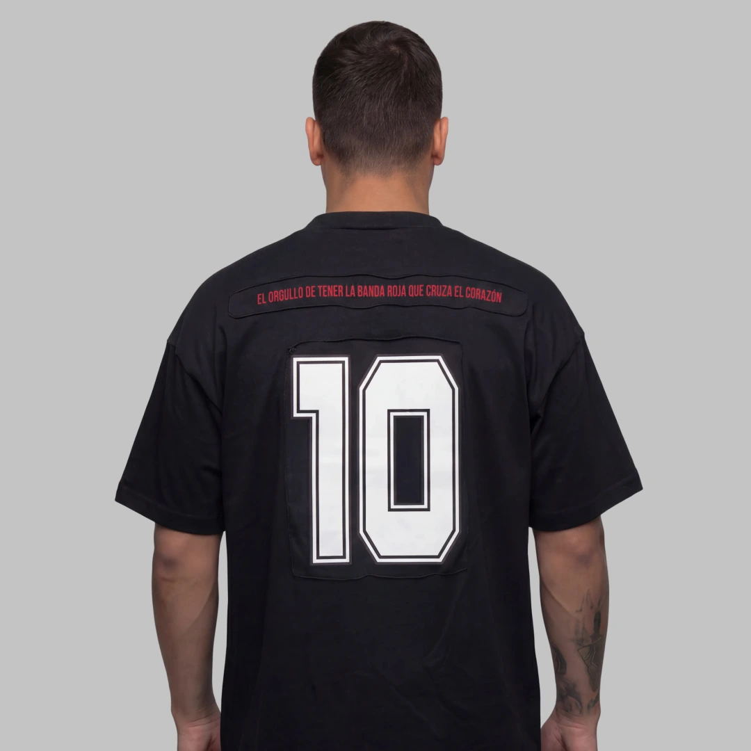 Polo elaborada en algodón, con silueta boxy fit. Cuello tejido a tono a la prenda, sobre hombros y mangas con líneas en contraste. Estampado en alta en el centro del frente y marquilla PVC sobre el ruedo del costado derecho. En el costado izquierdo, marquilla bandera de silueta de Juan Fernando Quintero. Espalda con estampación de texto en la parte superior en alta en tono rojo y en el centro espalda, estampado de número 10 en tono blanco.