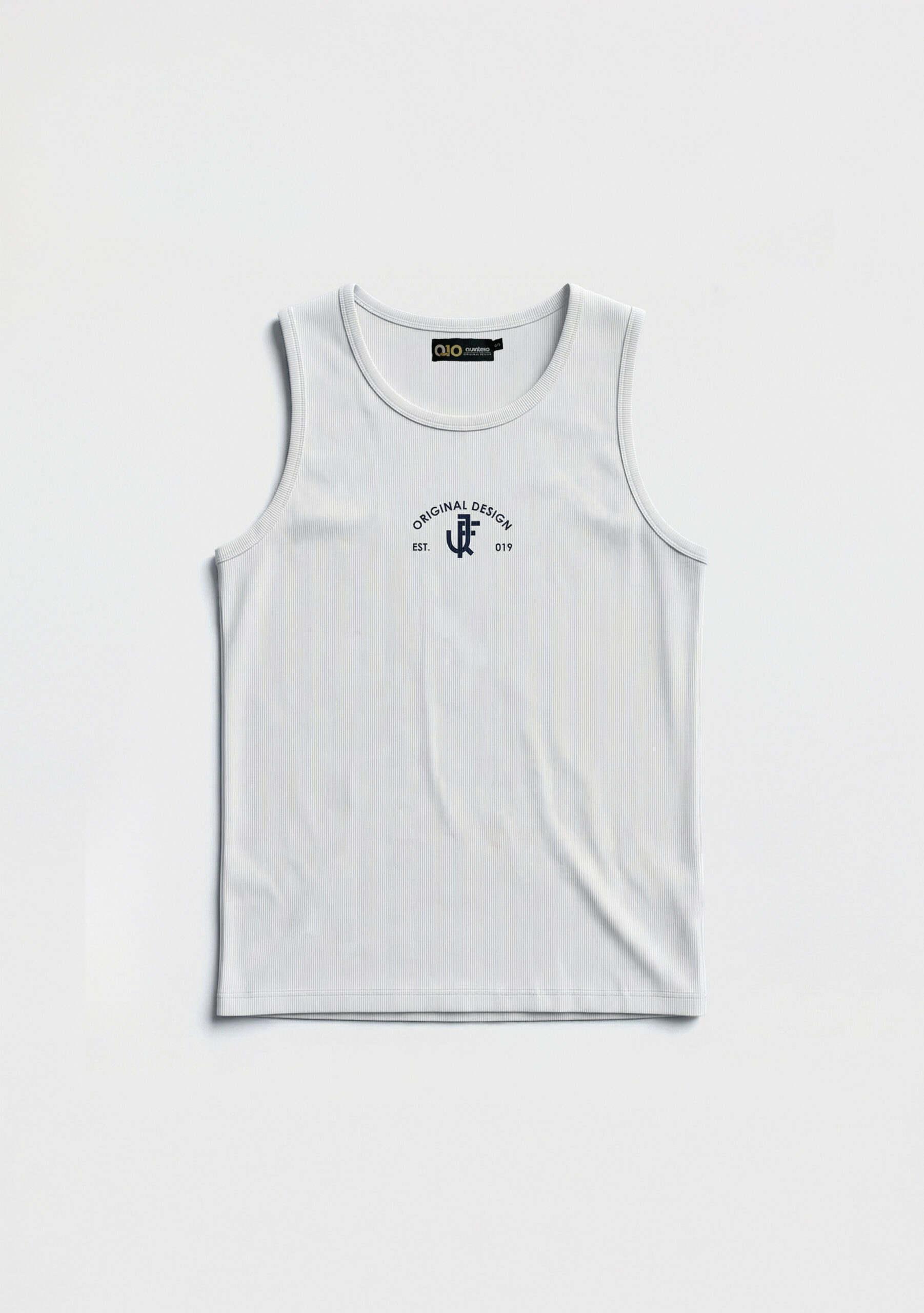 camisilla en rib (textura acanalada) de silueta slim ajustada al cuerpo, un basico indispensable con estampado en centro frente de logo de la marca, escote de cuello y sisa con sesgo en la misma tela, marquilla principal en cuello interno, marquilla bandera en costado izquierdo y marquilla pcv en posterior inferior sobre ruedo